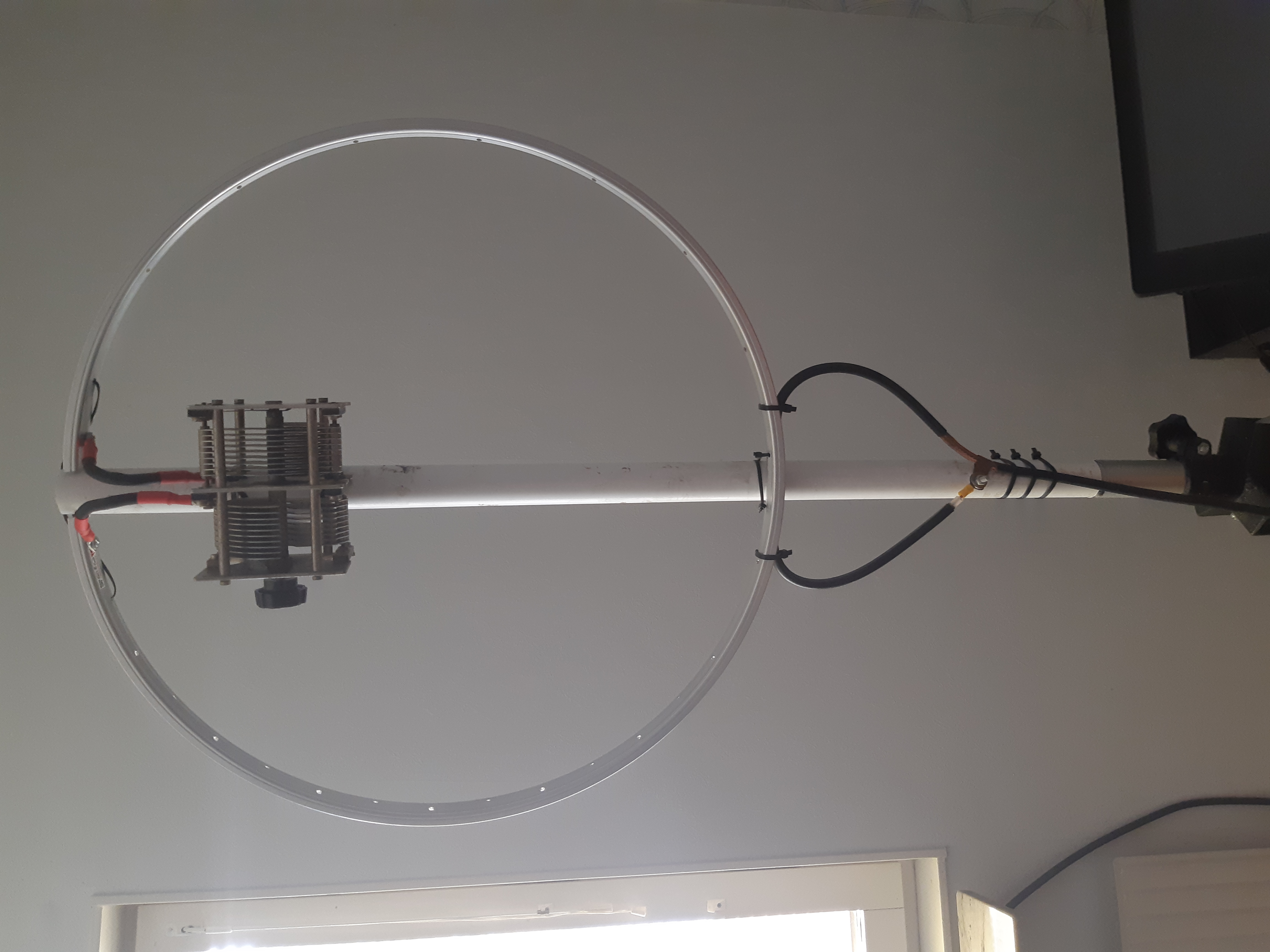 Min loop på 28 tum, denna fasta "spole" går inte att få någon annan frekvens i nuläget än mellan 10-30 m bandet. Min vridkonding är på 2x20-330 pf. Det går inte att stämma av denna antenn på andra band.