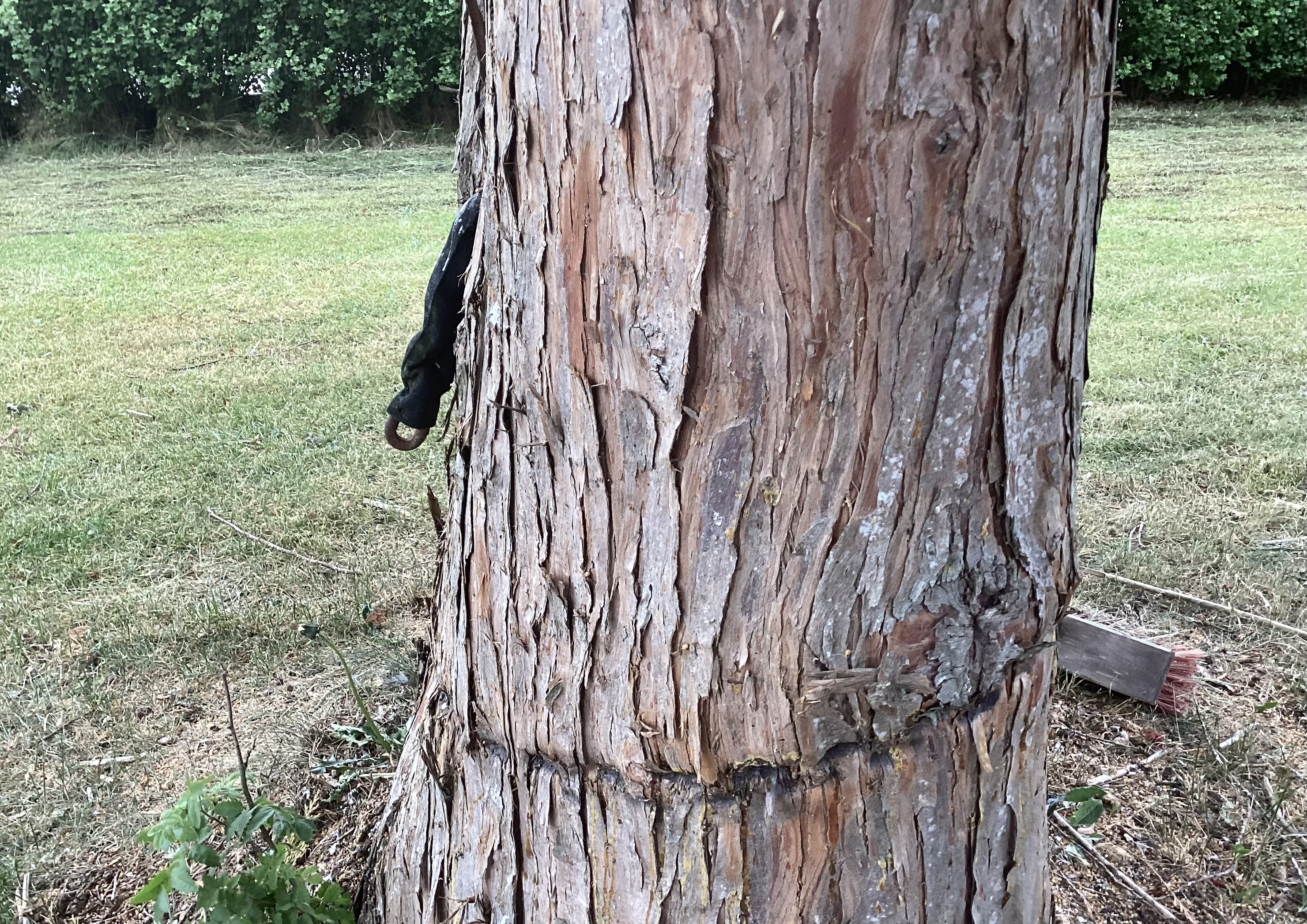 En stump länk hänger kvar…till vänster i bild…numera fastväxt i trädet att den ändå kan agera låskätting trots att den bara är en halvmeter lång..