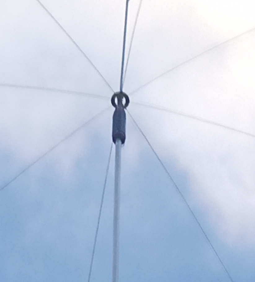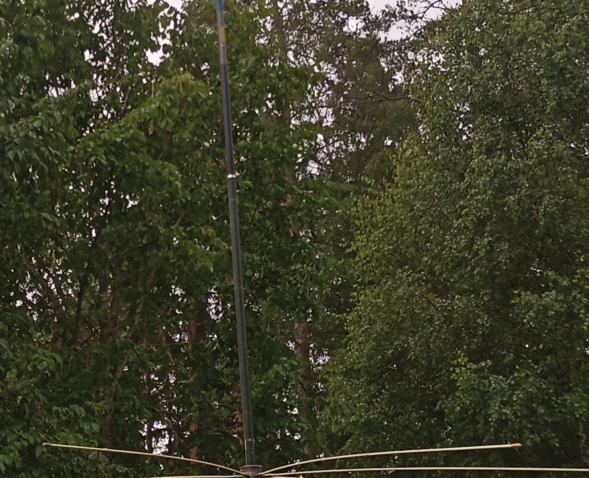 Detta är den första vertikalantennen med 8m glasfiber och tråd upp och en krans av spröt som jordplan.