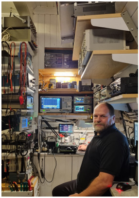 Hej på er, lite dålig fart på forumet så jag lägger in en bild på undertecknad i labbet tagen av min bättre hälft och på bänken med en FT-897 under operation. Byte av EEPROM-krets är förestående vilket är ett ganska vanligt fel på på den och 857:an.