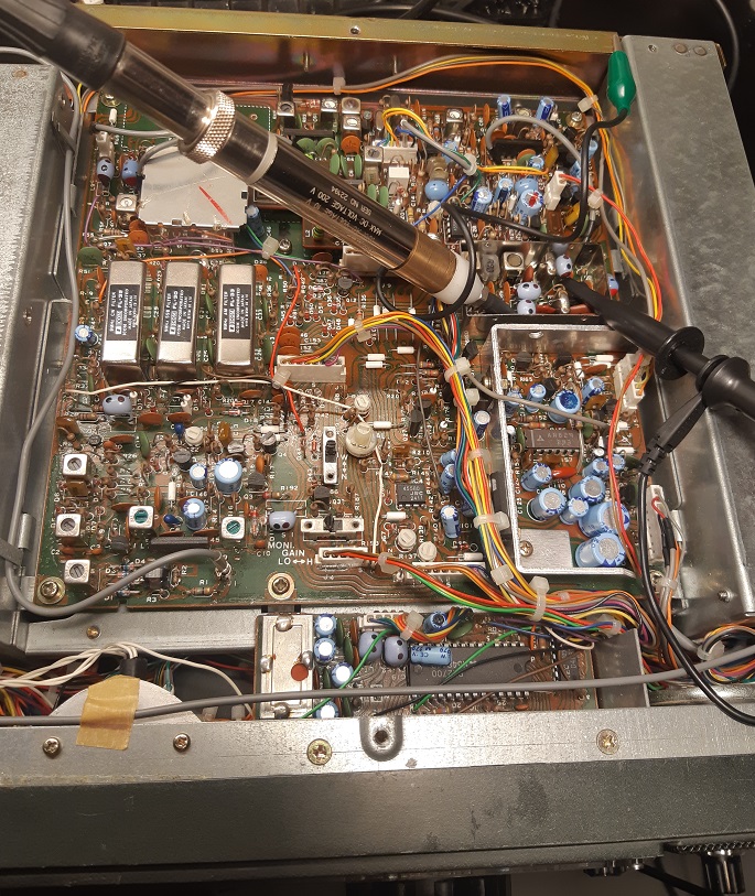 Det är två stycken trissor som styr biasen och där med effekten på på AM vilka jag plockade ur och mätte i komponenttestaren men båda var hela så jag satt tillbaka dem som från fabriken.