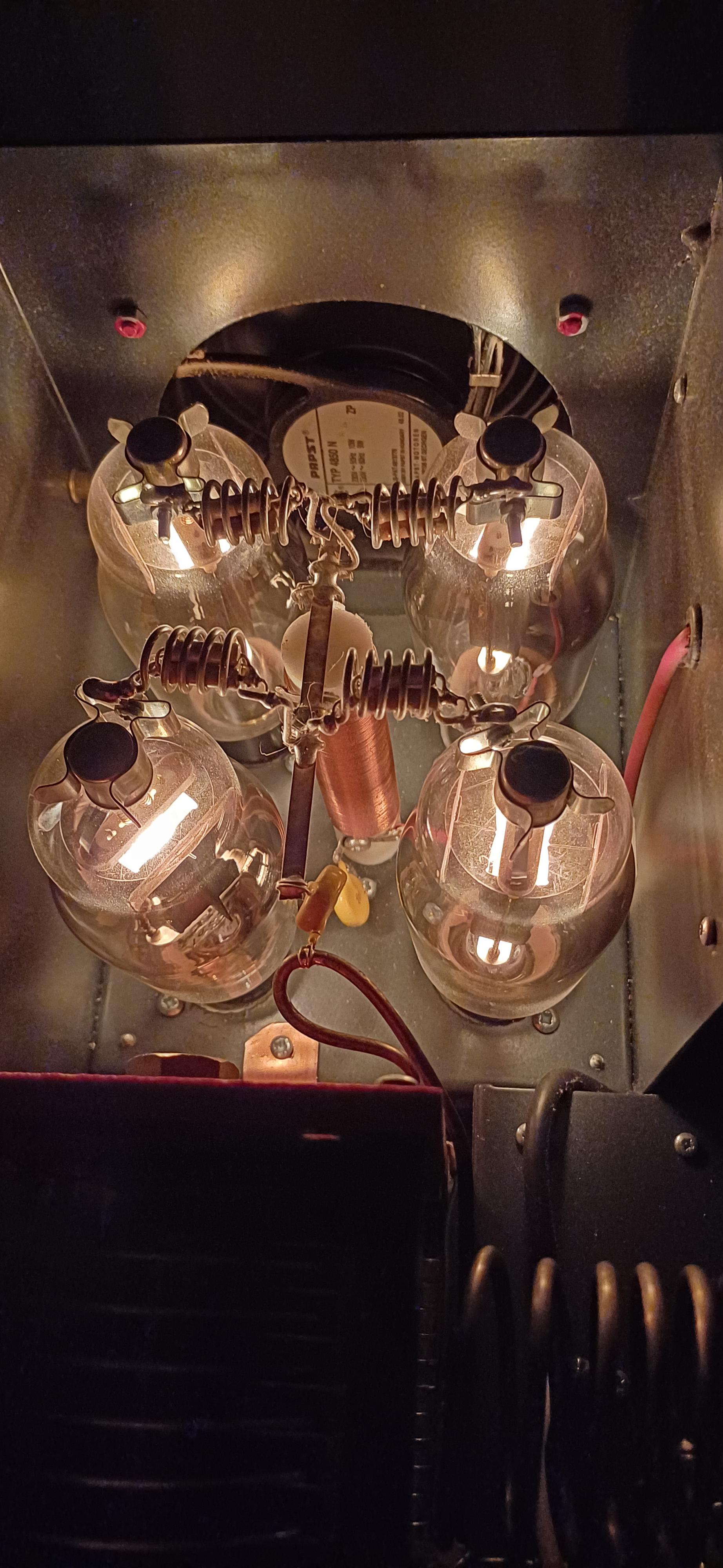 Parasitdrosslarna i Ameritron, sitter på ett kretskort och blir heta om man kör FM 10M, redan efter korta pass så de börjar lukta bakelit och har man otur börjar det ryka om dom, de sitter längre bort från resp anodcap i det här stegen i en lite annorlunda konfiguration (bättre).