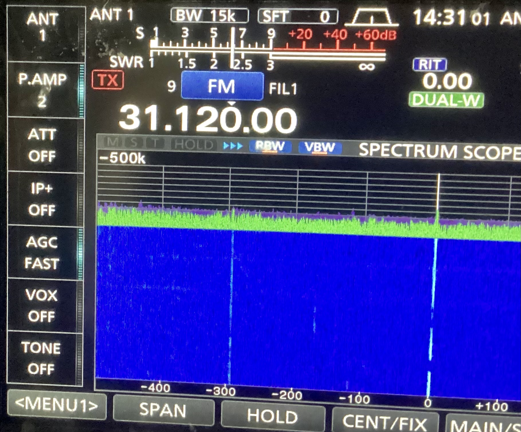 Edit: När jag precis postat såg jag en stark stapel i speccet på 31,120 FM o skynda dit och slog på Preampen. Helt klart amerikanskt…en man som precis lämnade över till en kvinnlig operatör.
