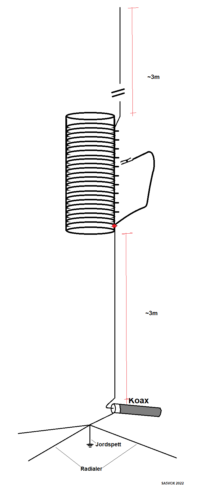 Det som är är nackdelen med en spole är ju att merparten av strömmen ju förbrukas i den och inte strålar ut så jättemycket i resten av toppsprötet om jag förstått det hela rätt, så egentligen borde man placera spolen nästan mitt på och stämma av där, då lär ens förkortade vertikal bli lite mer effektiv. Hur strålvinkel och lobar blir har jag dessvärre ingen koll på dock.